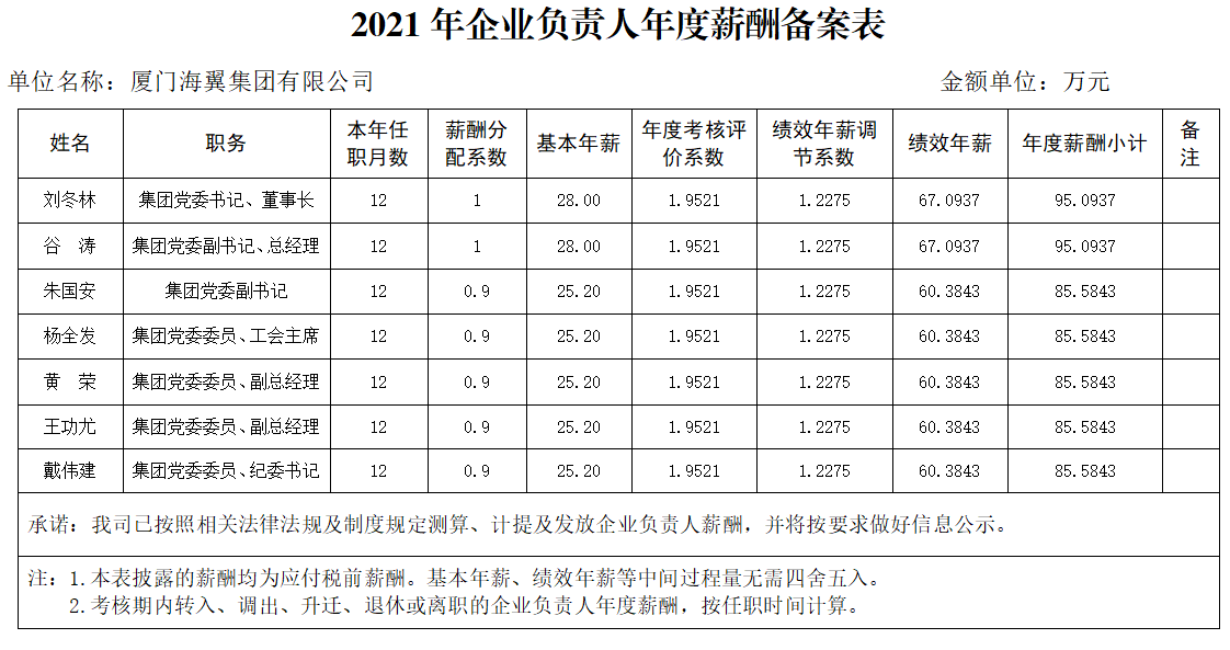 厦门海翼集团有限公司2021年企业负责人年度薪酬备案表